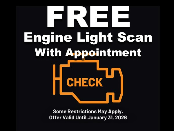 FREE Engine Light Scan FREE Engine Light Scan – With Appointment Valid until January 31, 2026 Click here to book an appointment. Back Share on Facebook - FREE Engine Light Scan (opens in a new window)Share on Twitter - FREE Engine Light Scan (opens in a new window)Share on LinkedIn - FREE Engine Light Scan (opens in a new window)