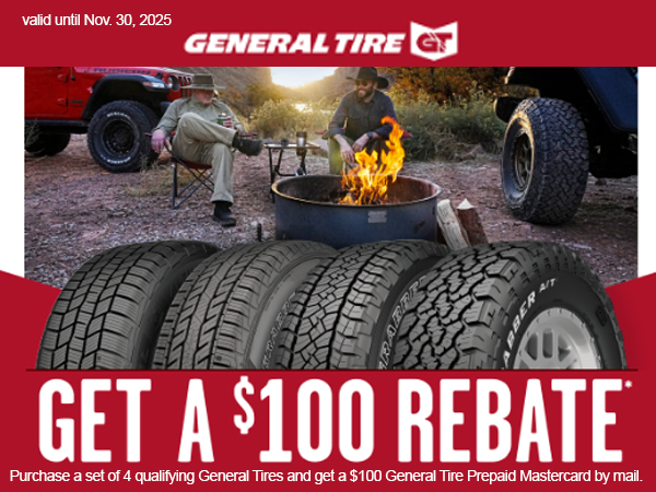 when you purchase a set of 4 qualifying General Tires and get $100 General Tire Prepaid Mastercard by mail.
